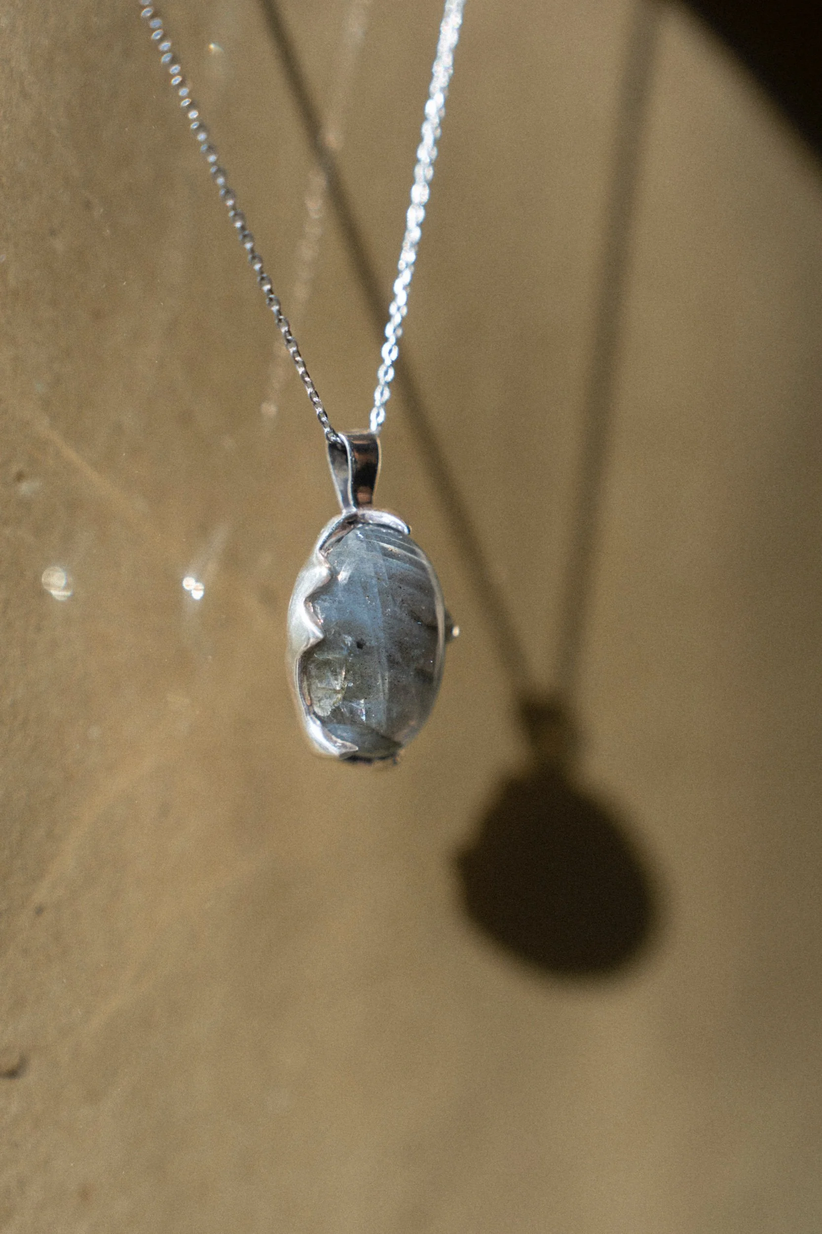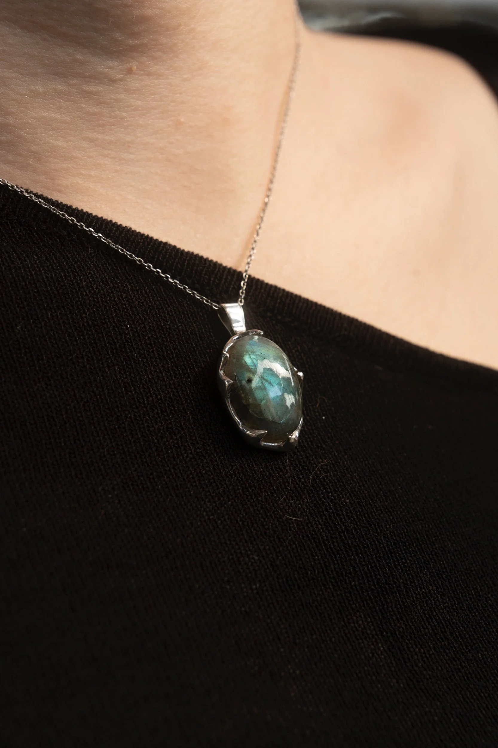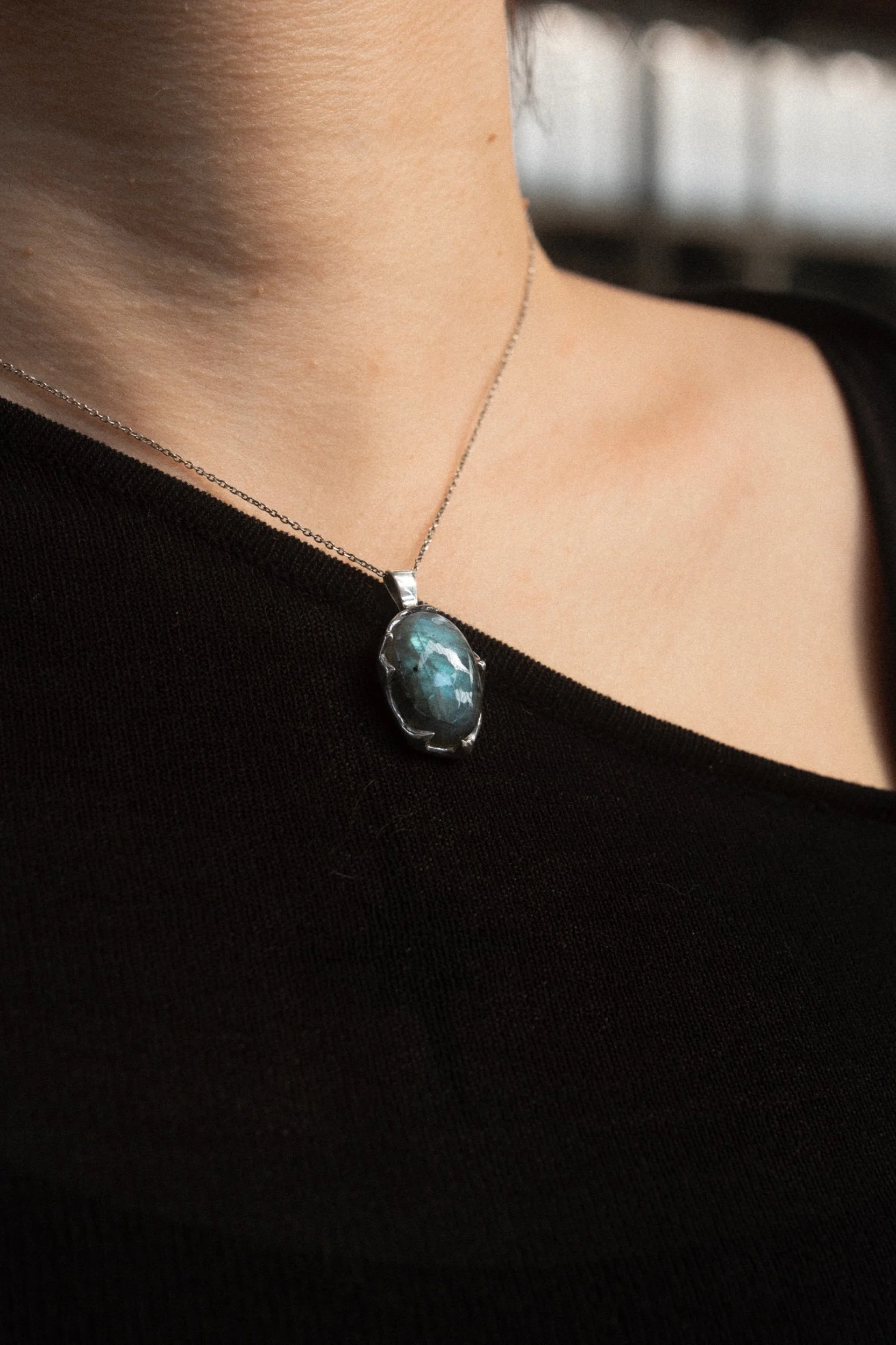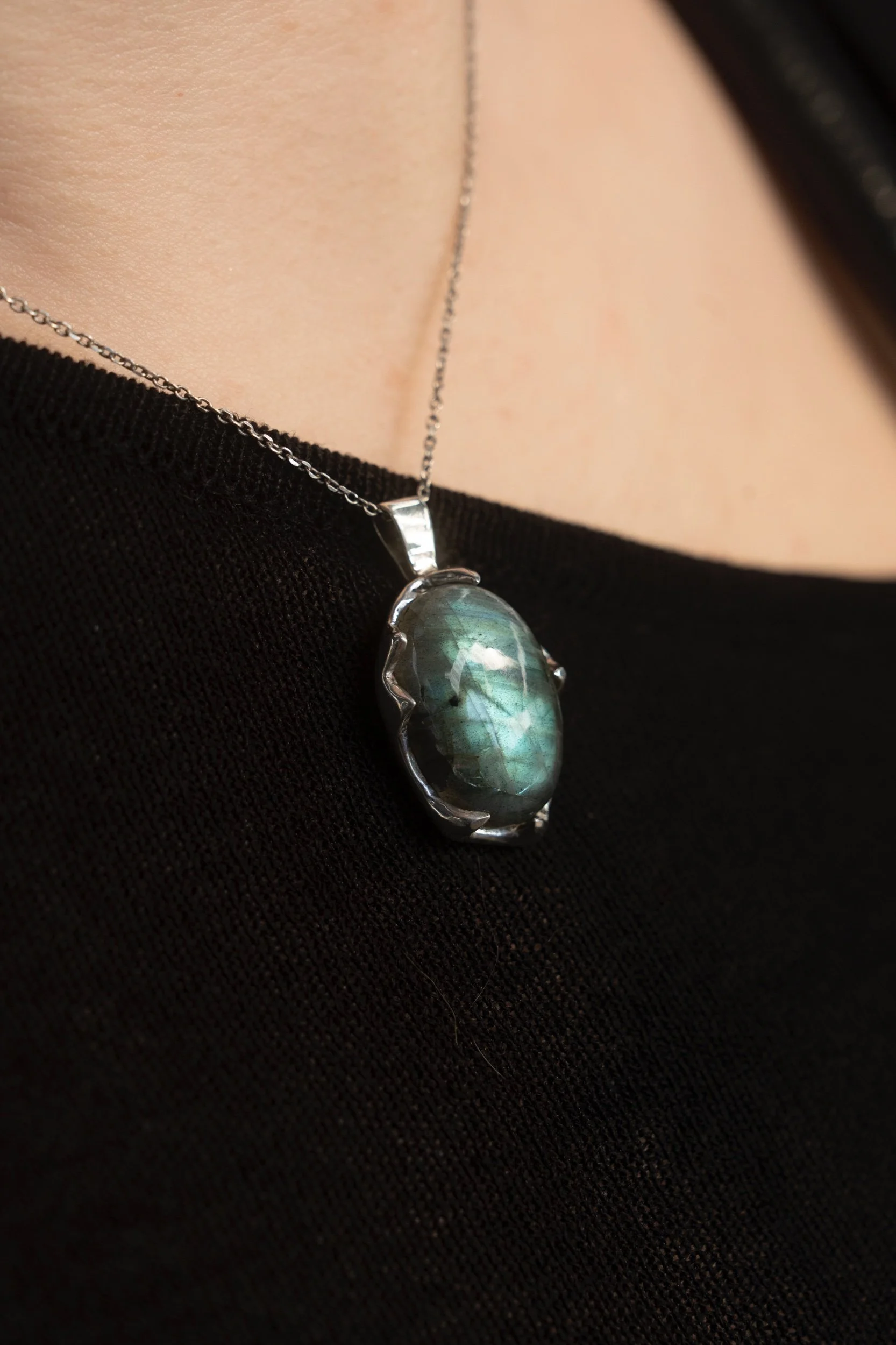 Image 1 of 5 Image 2 of 5 Image 3 of 5 Image 4 of 5 Image 5 of 5 Maren €170.00 925 sterling silver pendant with a unique organic design and a magic labradorite.Chain included. Quantity: Add To Cart Added! 925 sterling silver pendant with a unique organic design and a magic labradorite.Chain included.